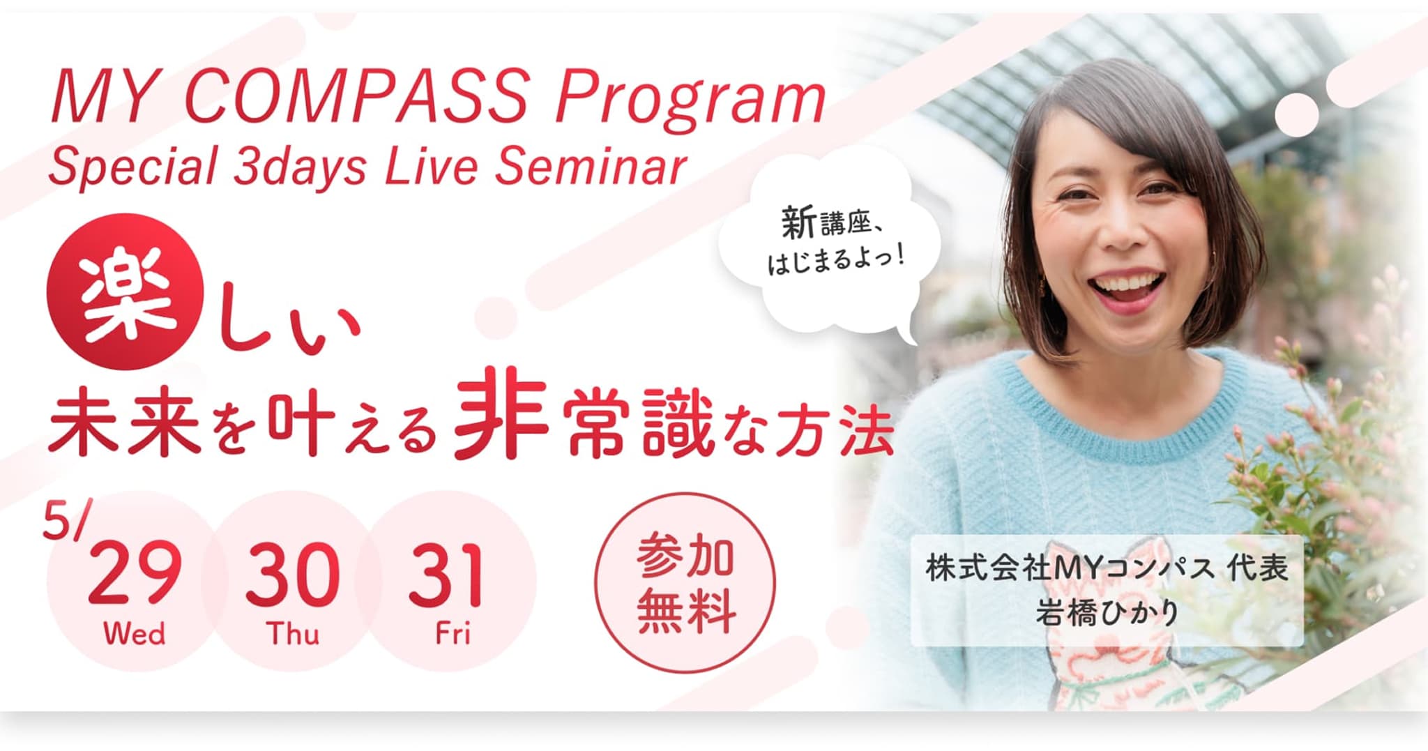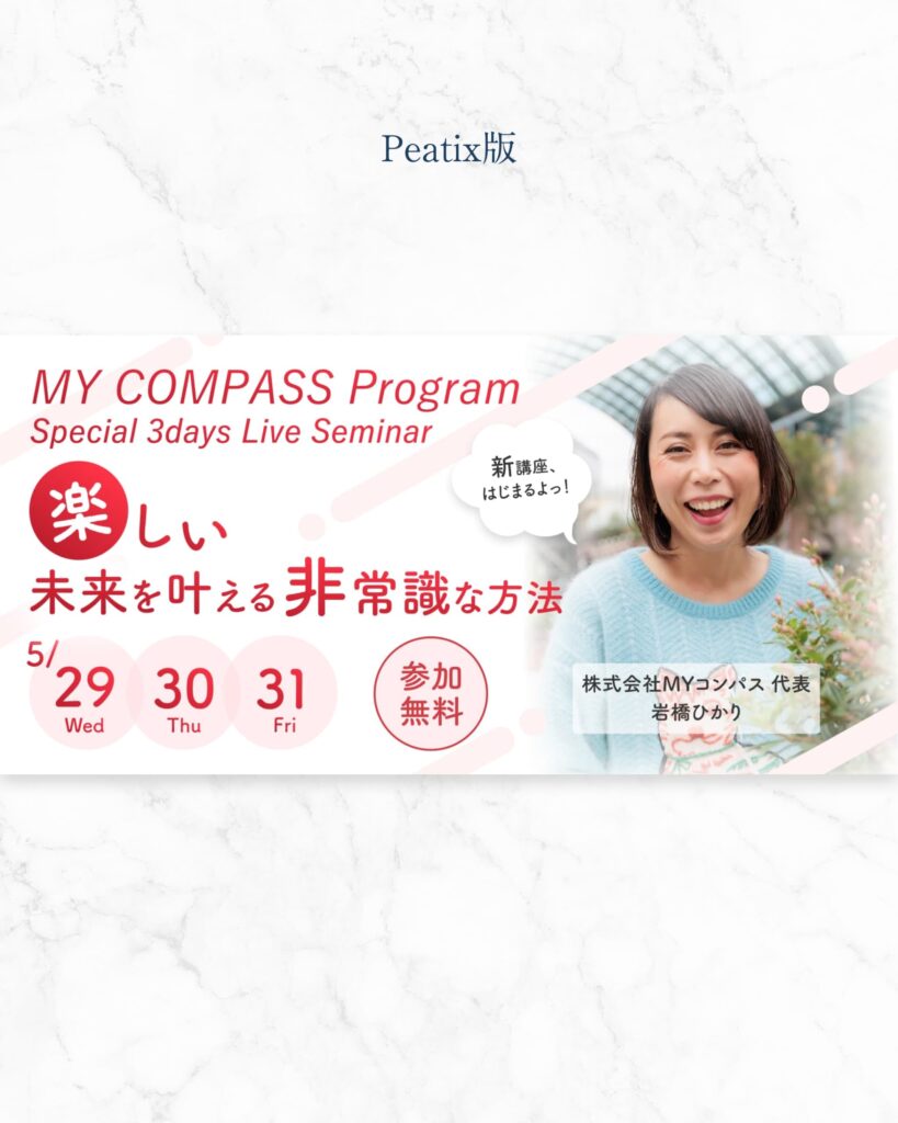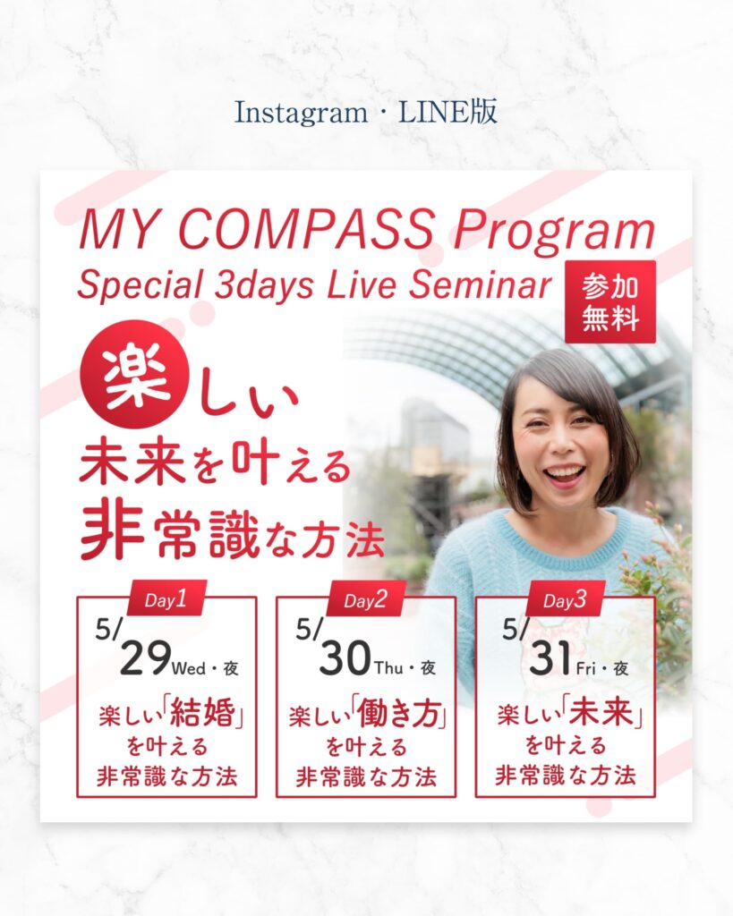 株式会社MYコンパス様より、新サービス「MYコンパスプログラム」をリリースされるタイミングで開催された、3daysライブセミナーの告知画像を制作させていただきました。