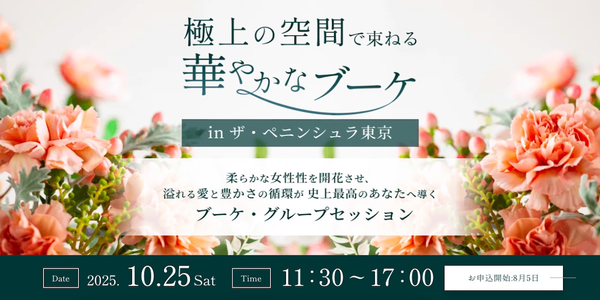 ブーケ・グループセッション in ザ・ペニンシュラ東京 ブーケ・グループセッション in ザ・ペニンシュラ東京。極上の空間で束ねる華やかなブーケ。柔らかな女性性を開花させ、溢れる愛と豊かさの循環が史上最高のあなたへ導きま...